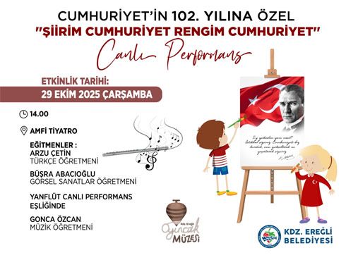 Cumhuriyet’in 102. yılına özel olarak düzenlenecek etkinlikler kapsamında Kdz.Ereğli Belediyesi Oyuncak Müzesi tarafından 29 Ekim Çarşamba günü Amfi Tiyatro’da “Şiirim Cumhuriyet, Rengim Cumhuriyet“ isimli canlı performans etkinliği gerçekleştirilecek. Kdz. Ereğli Belediyesi tarafından Cumhuriyet’in 102. yılına özel olarak düzenlenecek etkinlikler kapsamında Oyuncak Müzesi’nde, “Şiirim Cumhuriyet, Rengim Cumhuriyet “ isimli canlı performans etkinliği gerçekleştirilecek.